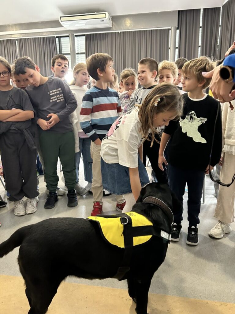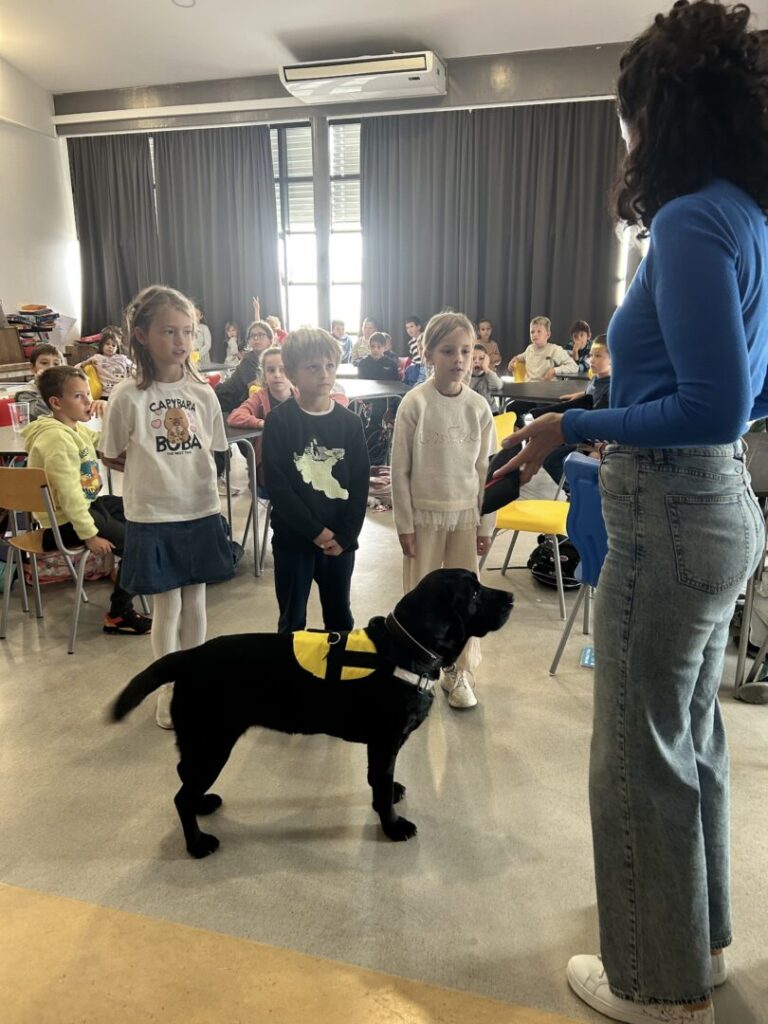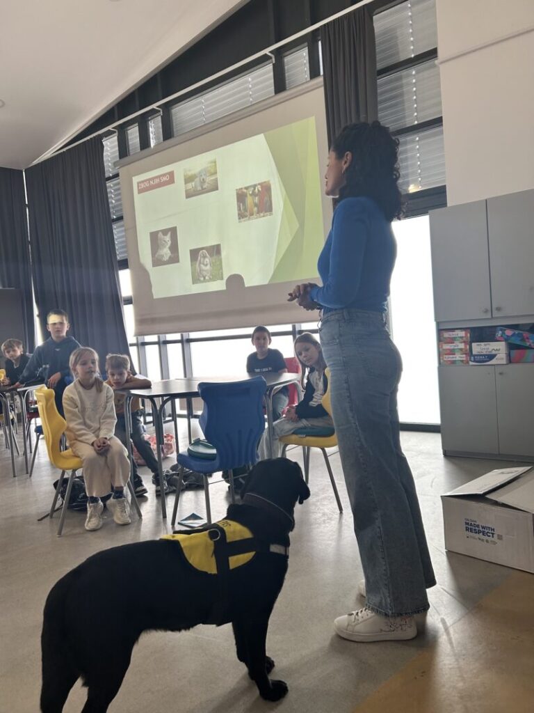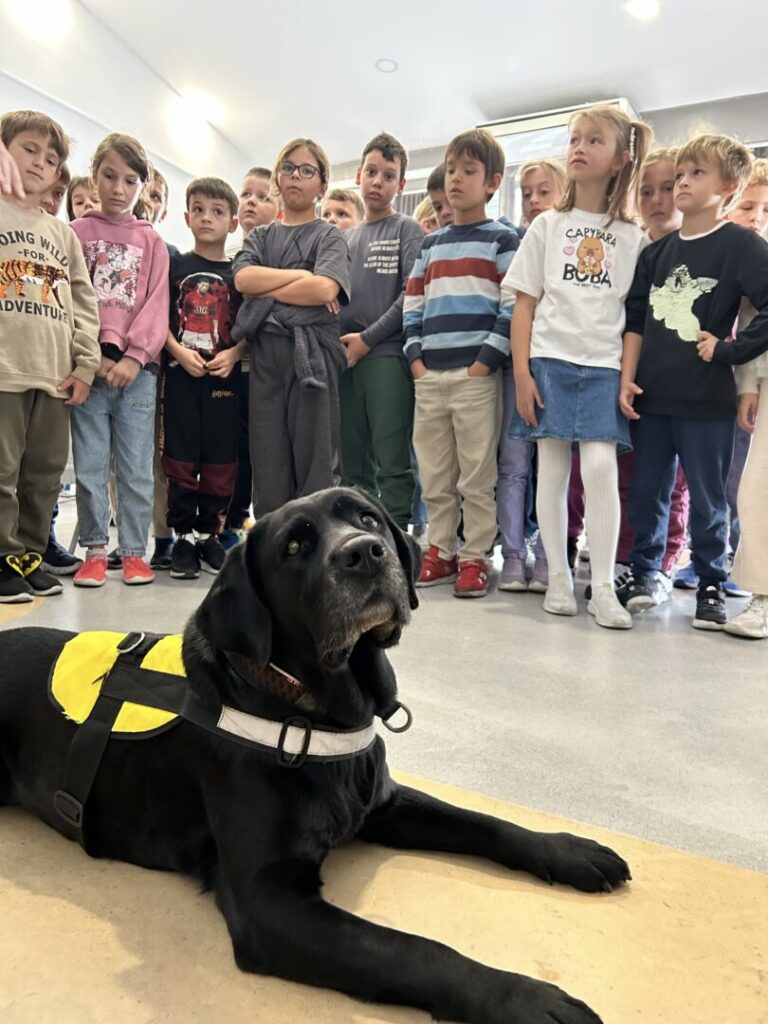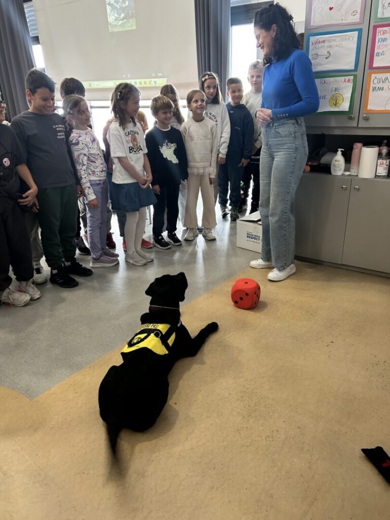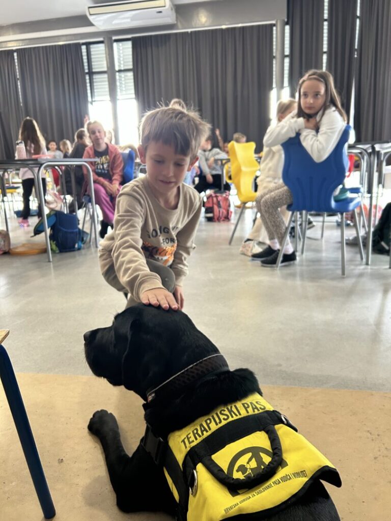 Na prvoj radionici posjetila nas je Sunčica, terapijski pas. Sunčica je pokazala iznimno strpljenje i nježnost prema svim našim drugašima. Učenici su naučili kako pravilno prići psu, što je sve psima potrebno te kako se odgovorno brinuti o kućnom ljubimcu. Sunčica je strpljivo dopustila svakom djetetu da je pomazi, što je djecu posebno razveselilo.