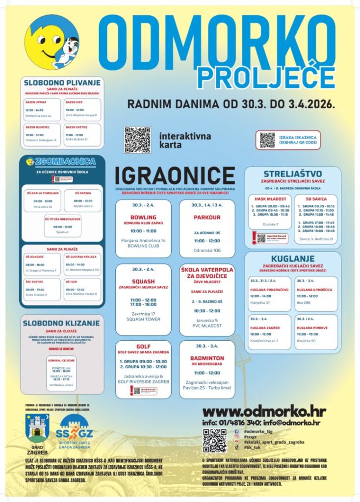 Školski sportski savez Grada Zagreba tijekom proljetnog odmora učenika, od 30. ožujka do 3. travnja 2026., organizira program Odmorko proljeće.